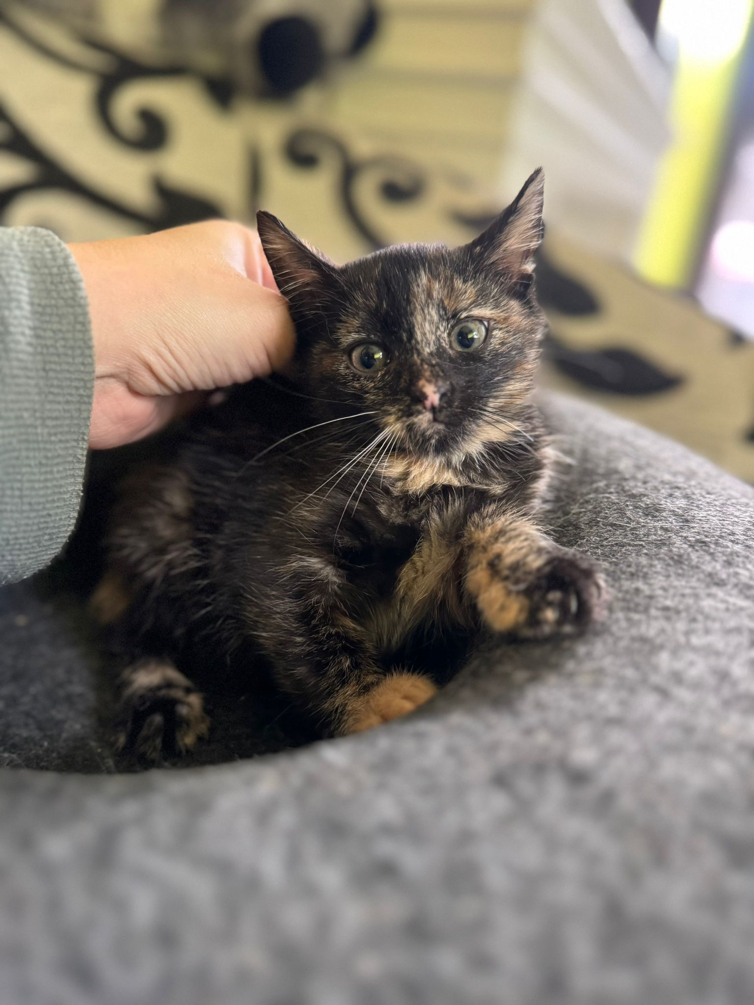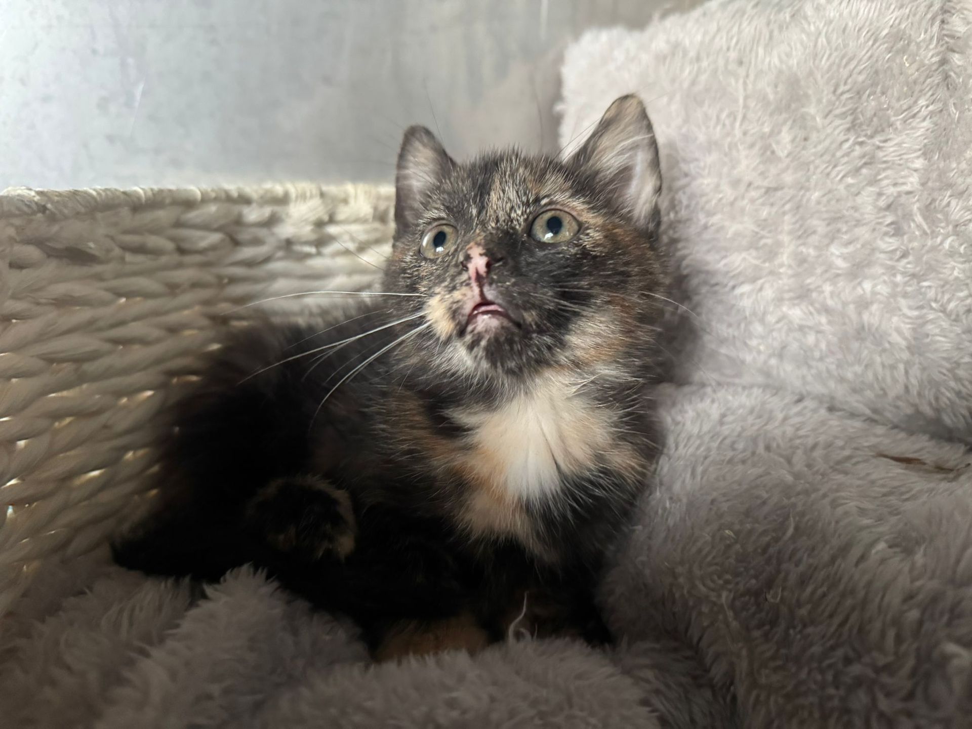 Sie ist ein freundliches, altersgerecht verspieltes, kleines Katzenmädel, das sich sehr nach menschlicher Nähe, Aufmerksamkeit und Streicheleinheiten sehnt.