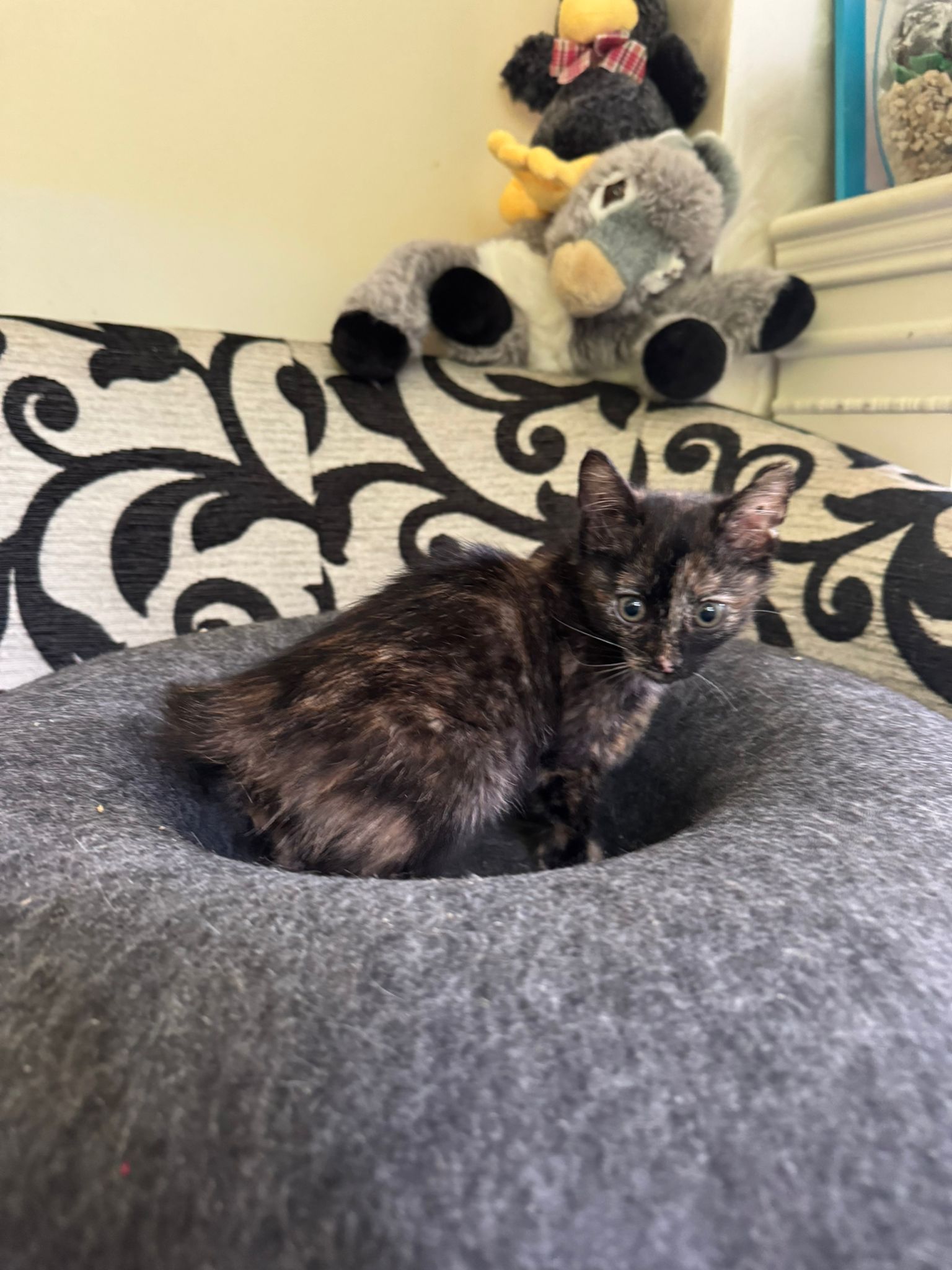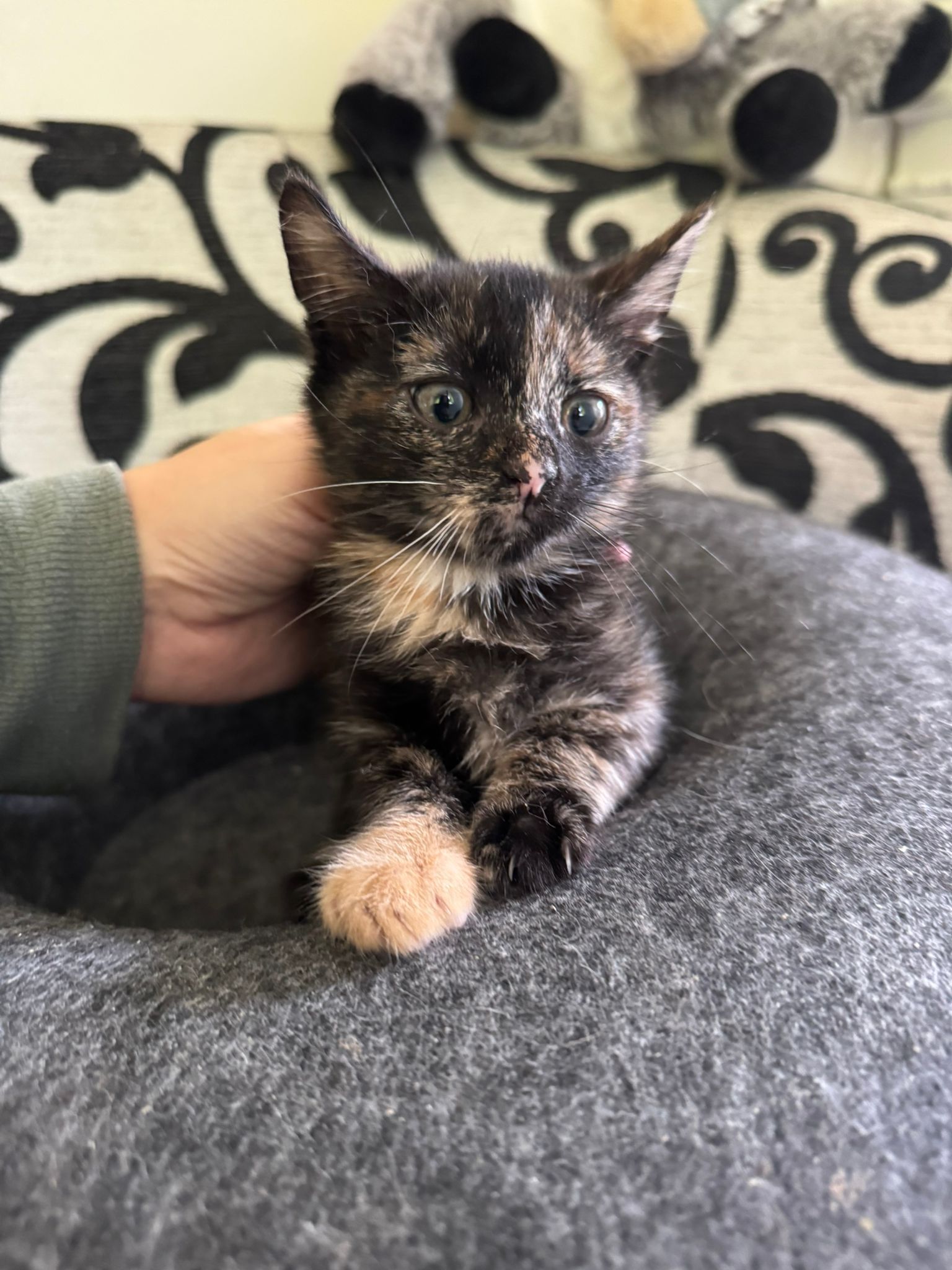 Jollie wurde mit ihren beiden Geschwistern Blondie und Lolita in einem Karton ausgesetzt gefunden - bei ihnen ihre verstorbene Mama. Unsere Tierschützerin hat sie bei sich aufgenommen und kümmert sich nun liebevoll um die 3 Waisenkitten, die sich prima entwickeln.