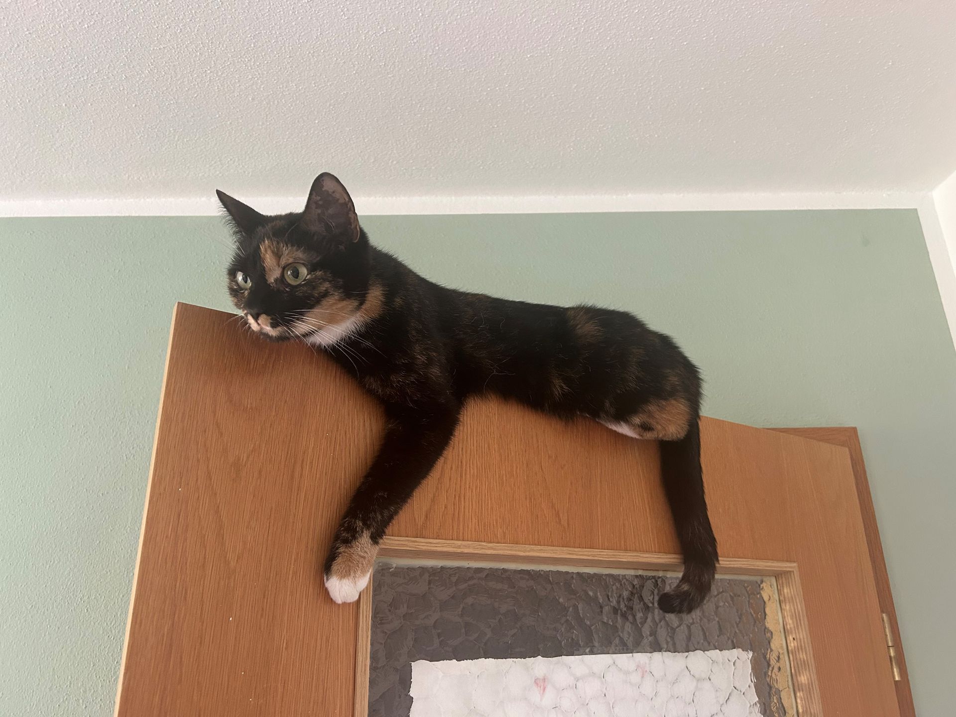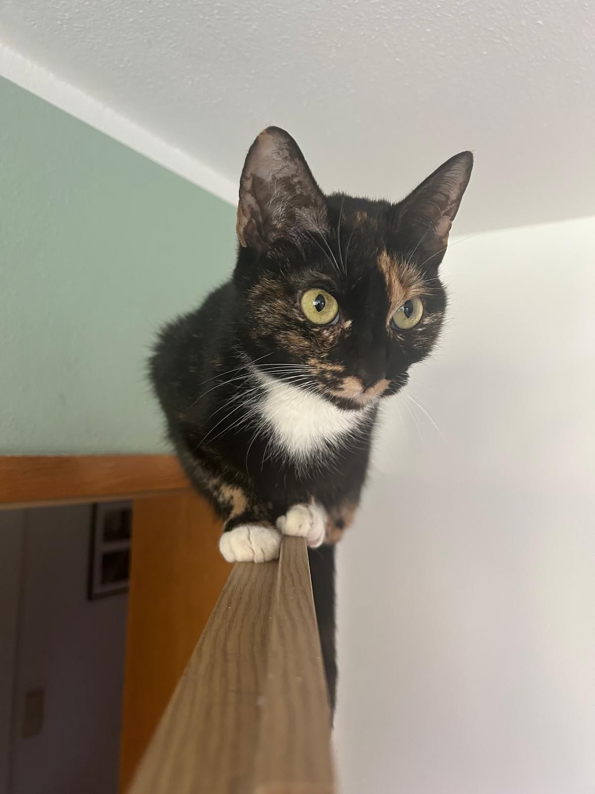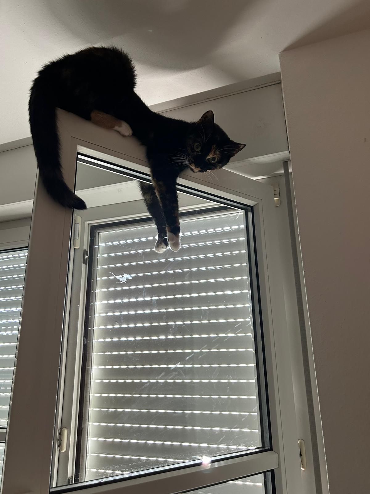 Cookie kann sehr hoch springen und liebt es, auf dem Türrahmen zu sitzen un herunter zu schauen.