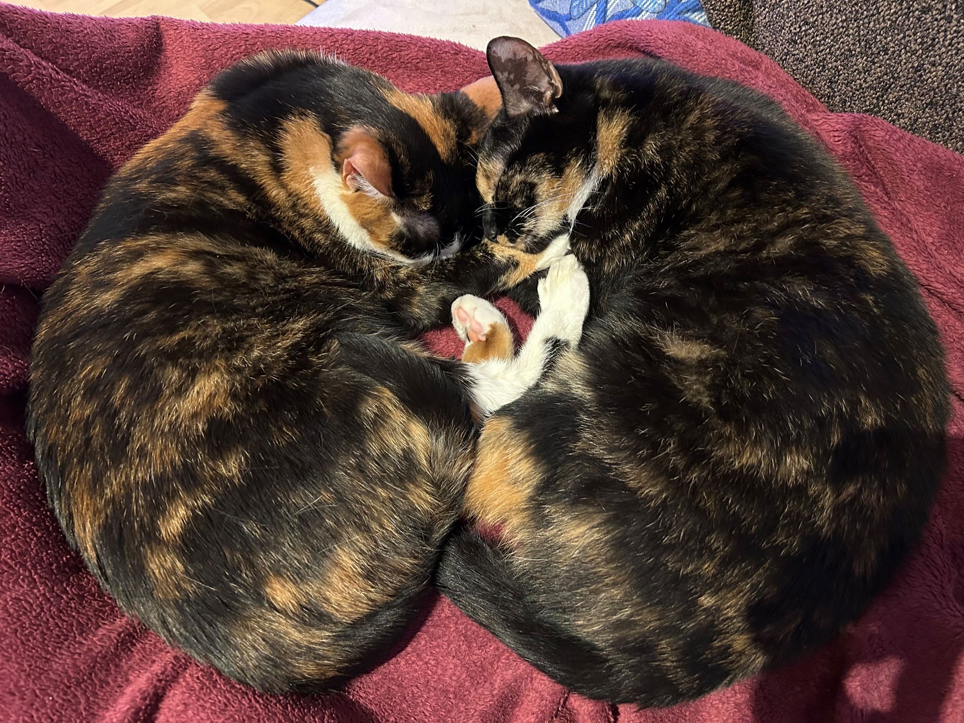 Cookie (die dunklere): ist die schnellere, wenn es darum geht einer Schnur mit Glöckchen und Federn hinterher zu jagen und sie trägt dann ihre Beute dann stolz davon.