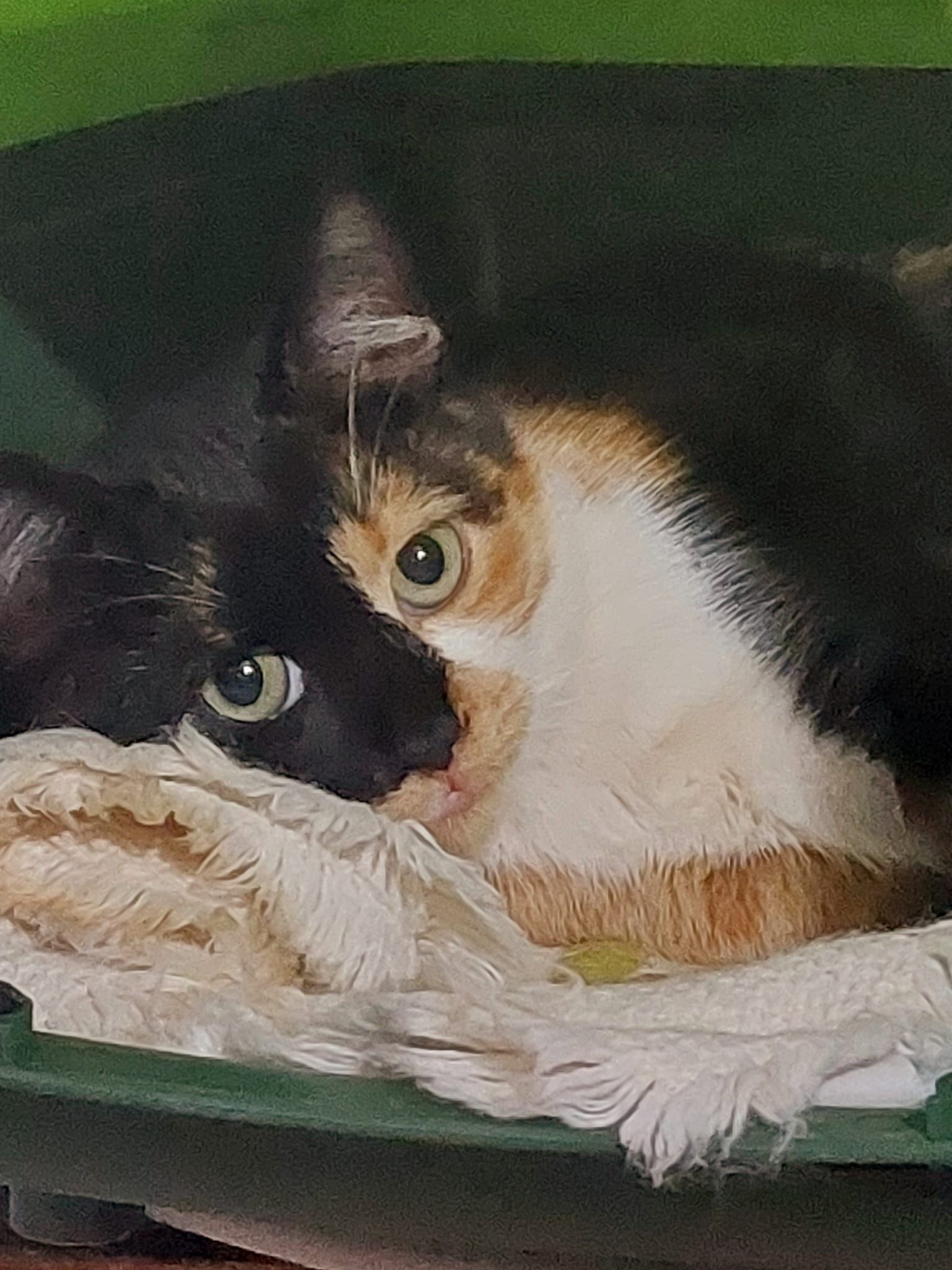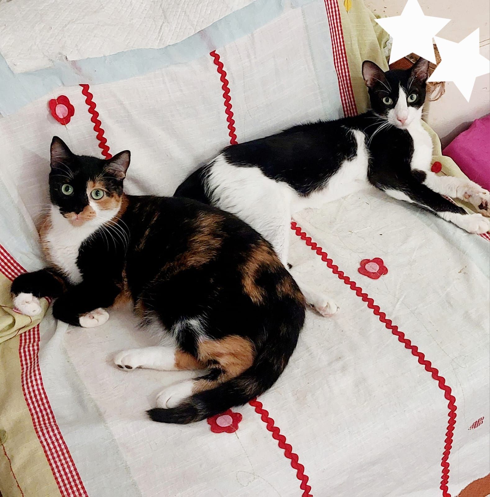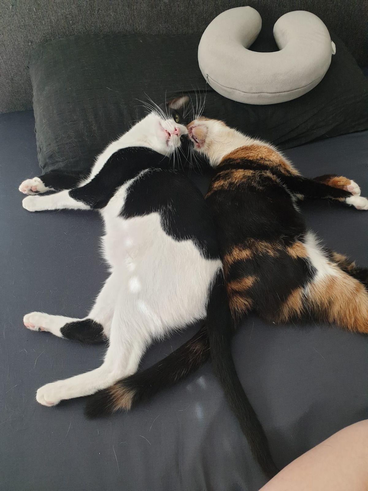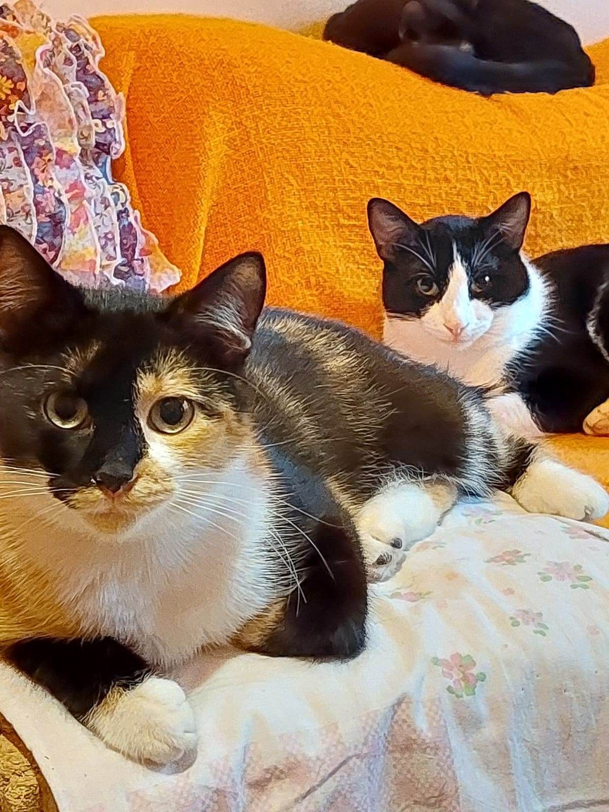 Die beiden leben auf ihrer Pflegestelle in einer Gruppe mit vielen anderen Katzen zusammen.