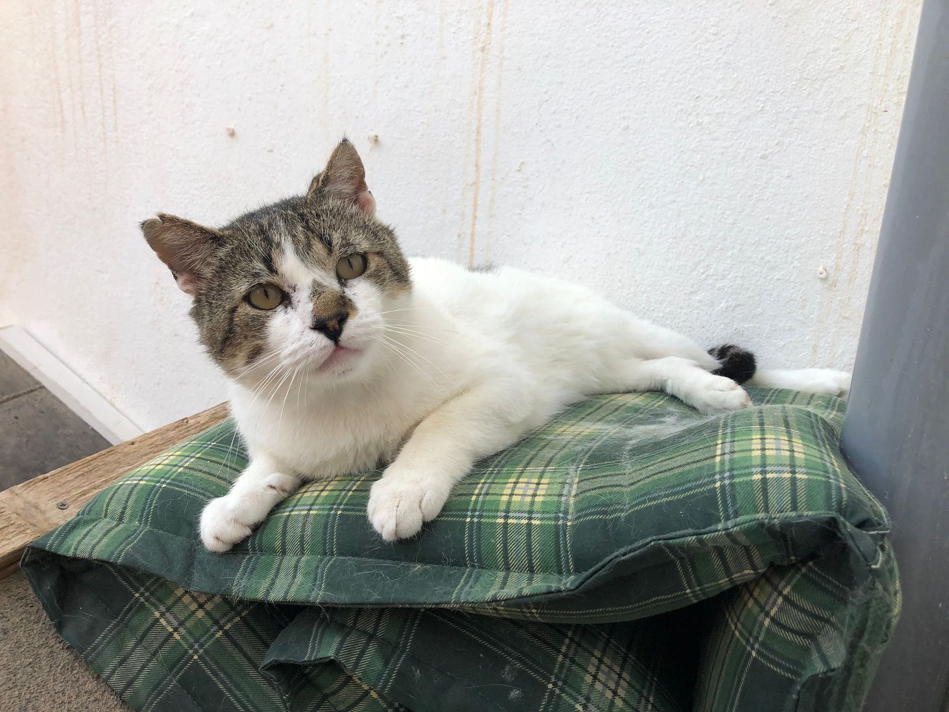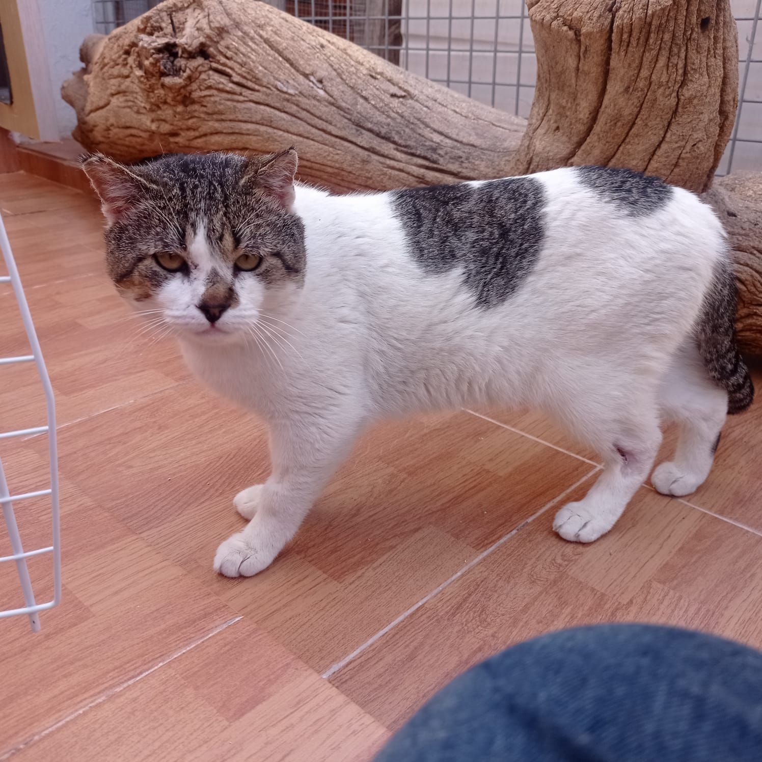 Beim Tierarzt Check wurde dann festgestellt, dass Mikel FIV positiv ist, und das Hinken auf eine alte, unbehandelte Wunde zurückzuführen ist. Diese alte Wunde wurde offensichtlich nicht behandelt.