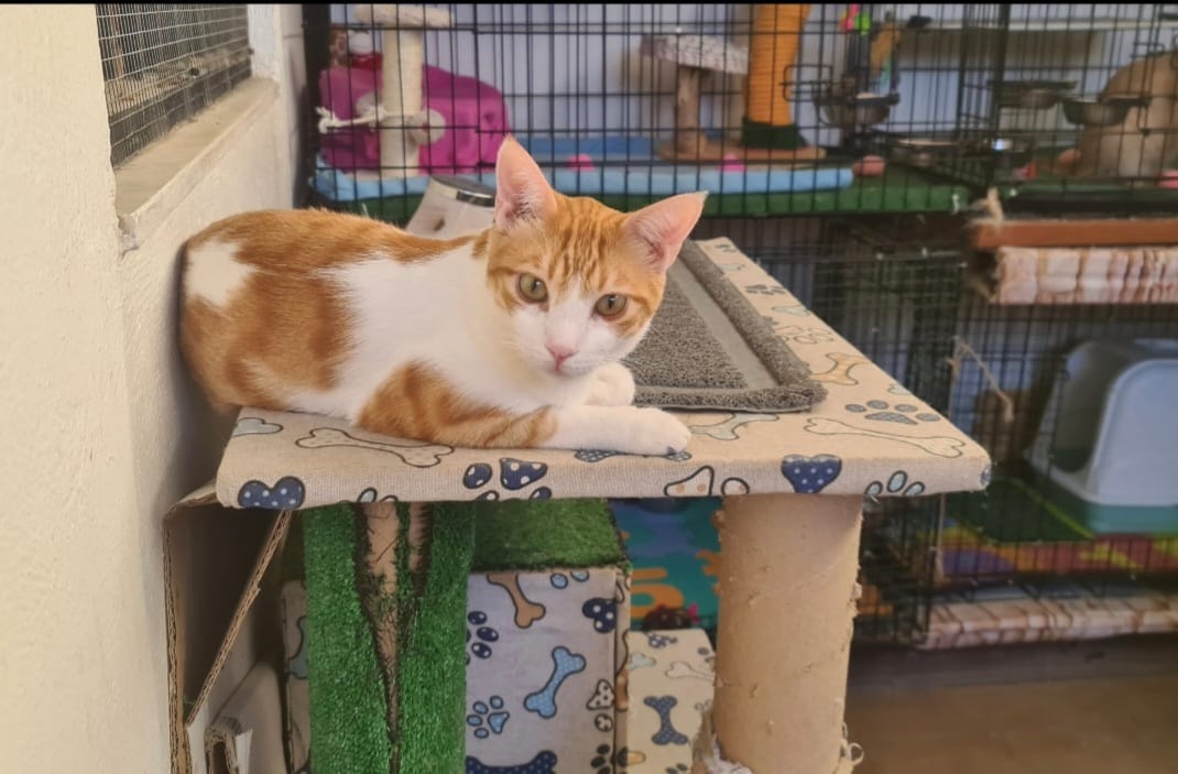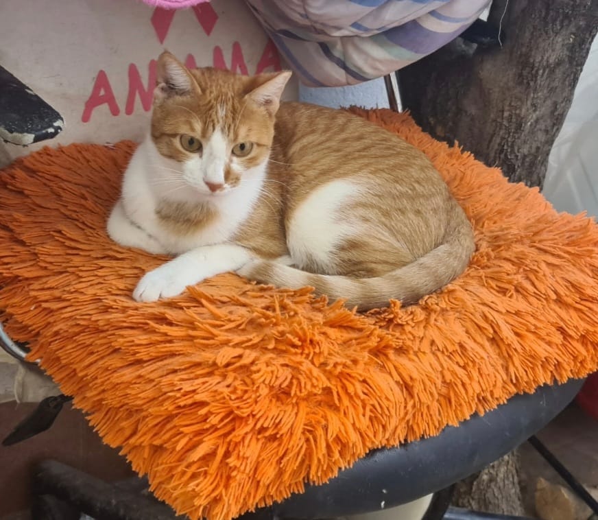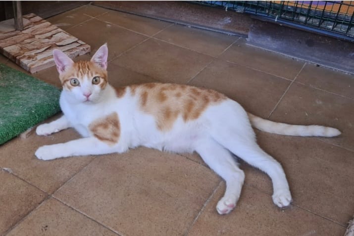 Der kleine Noah tauchte eines Tages in einer von uns gefütterten wilden Kolonie auf. Noah wurde ganz sicher ausgesetzt und so seinem Schicksal überlassen, denn er war gerade einmal ca. 2 Monate alt und hätte allein dort nicht überlebt, denn die erwachsenen Katzen der Gruppe attackierten ihn. So hat Noahs heutige Pflegestelle ihn aufgenommen.