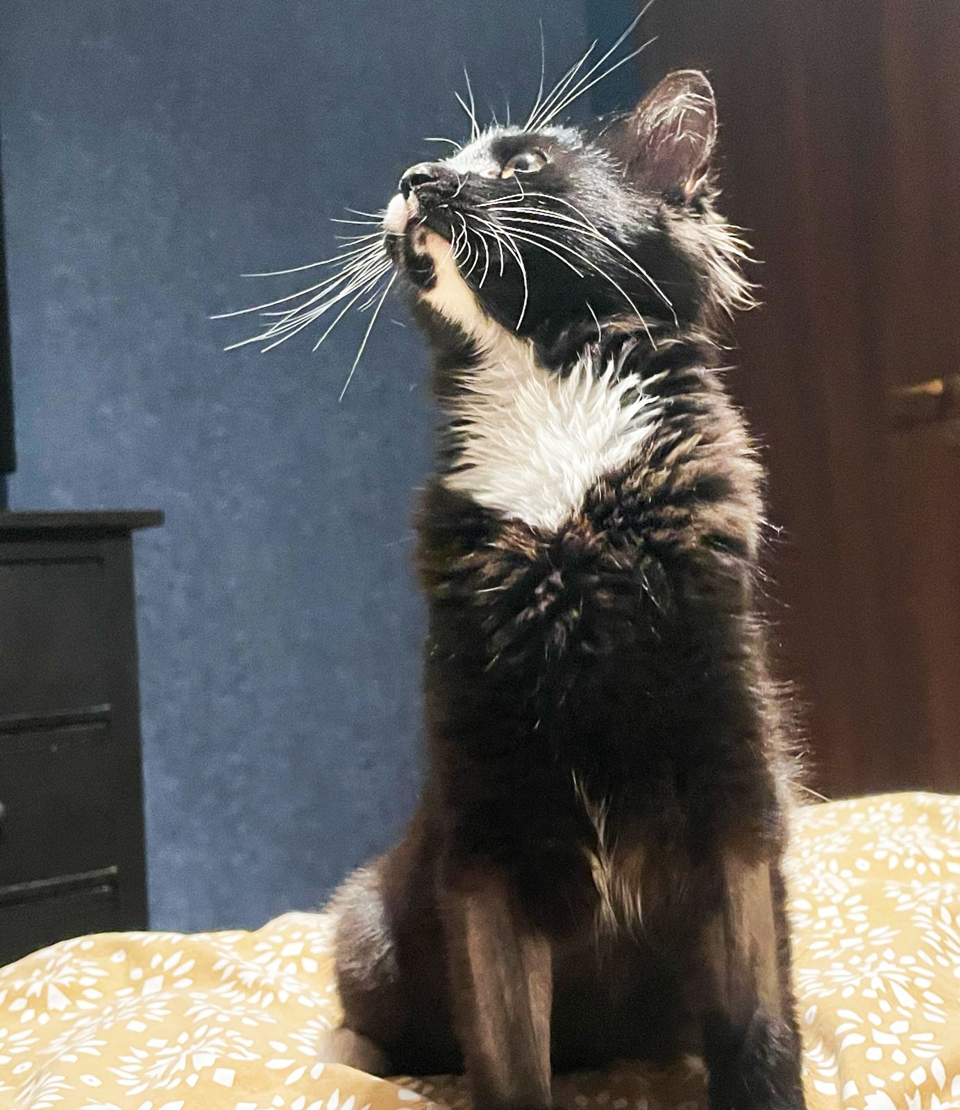 Patch ist ein kleiner witziger Katzr, der immer aufgelegt ist, irgendwas u machen, was seinen Menschen zum Lachen brignt. Er ist auch gerne in der Nähe ihres Menschen und freut sich über jede Kuscheleinheit.